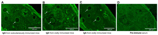 Indirect immunofluorescence microscopy to detect the binding of antibodies against HBcAg-mZP3 to ZP matrix. Sections from the same ovary were used. Wild mouse ovarian sections treated with (A) serum from subcutaneously immunized mice, (B) serum from orally immunized mice, and (C) fecal extracts from orally immunized mice. (D) Control experiments were performed with pre-immune serum. Arrows point to antibodies that reacted with the zona pellucida. Scale bars = 200 µm.
