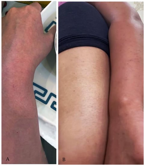 Serum sickness syndrome and urticarial vasculitis might be difficult to distinguish from serum sickness-like reactions. Though erythrocyte extravasation raises the possibility of urticarial vasculitis, limited perivascular leukocytoclastic has been documented in a prior case of serum sickness-like reaction, and therefore does not necessarily suggest the existence of vasculitis []. Joint involvement is also more common in hypocomplementemic urticarial vasculitis than in normocomplementemic urticarial vasculitis [,,,]. Furthermore, although not all viral infections are studied, these diagnoses are uncommon since they are frequently accompanied by additional viral infection-specific symptoms (e.g., transaminitis for viral hepatitis and pharyngitis for Epstein–Barr virus infection).
