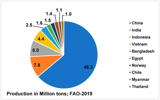 Currently, aquaculture production is the fastest expanding animal food sector in the world []. In 2019, aquaculture production totaled 85.3 million tons, up 3.7% over 2018, with China (48.2 million tons), India (7.8 million tons), Indonesia (6.0 million tons), Vietnam (4.4 million tons), Bangladesh (2.5 million tons), Egypt (1.6 million tons), Norway (1.5 million tons), Chile (1.4 million tons), Myanmar (1.1 million tons), and Thailand (1 million tons) were the top ten aquaculture producers in 2019 (Figure 1) []. In the world of aquaculture, inland finfish culture was the most important sector. In 2019, 56.3 million tons of finfish (66.0%), 17.6 million tons of mollusks (20.6%), 10.5 million tons of crustaceans (12.3%), and 977 thousand tons of other aquatic animal species were produced in aquaculture around the world. Between 2011 and 2015, the global aquaculture production of aquatic animals grew at a pace of 5.0 percent each year on average. During the period 2016–2019, the yearly growth rate slowed to an average of 3.7 percent. Aquaculture has progressively increased its share of total aquatic animal output from capture and aquaculture combined from 39.9% in 2010 to 48.0% in 2019. Fish accounted for roughly 17.3% of the global population’s animal protein intake and 6.8% of all proteins taken in 2017, with global per capita consumption of fish estimated at 20.3 kg. Fish provides around 3.3 billion people, with nearly 20% of their average per capita diet on animal protein, and 5.6 billion people with 10% of such protein. By the year 2025, total global fish production is predicted to reach 196 million tons (Mt), with aquaculture expected to overtake total catch fisheries production []. In the last three decades, from 1990–2018, it showed 527% growth reached by producing 82 million tons for the estimated value of 250 billion USD of its first sale [,].