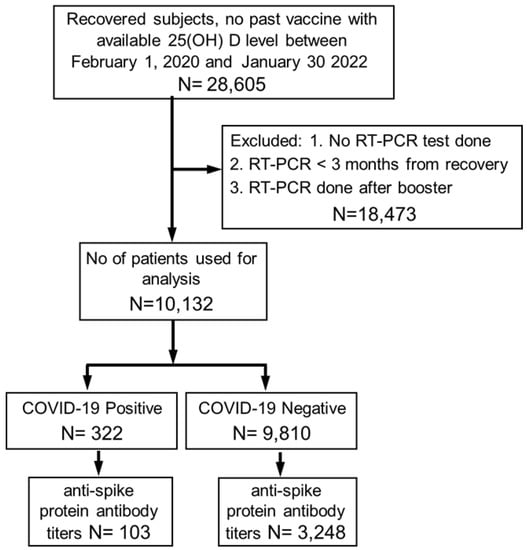 During the study period, 28,605 convalescent subjects with available baseline plasma 25(OH)D levels, and without previous vaccination were identified. Of this group, 10,132 subjects who fulfilled the inclusion criteria comprised the study cohort. The flow diagram used for cohort selection is displayed in Figure 1, while their characteristics at inclusion are shown in Table 1. Notably, the median interval that elapsed from the time of 25(OH)D measurement to the time of the first documented infection was 4 months (IQR: 1–7). As mentioned before, all of the trial’s participants had an RT-PCR test for SARS-CoV-2 performed ≥ 3 months after recovery. Overall, the reinfection rate was 3.3% at a median follow-up of 8.6 months (6.2–11.3). In other words, 96.7% of the study population were RT-PCR negative at a median of 6.7 months (3.8–9.3).