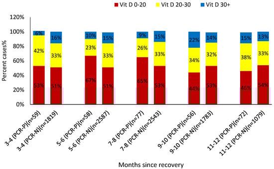 Percent cases with negative/positive RT-PCR classified by baseline 25(OH) D levels at each time point since recovery. PCR-P—PCR Positive; PCR-N—PCR Negative. n-Number of individuals at each period, in the positive and negative PCR results.