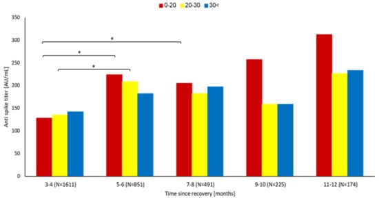 Anti-spike antibody titers of the convalescent group stratified by baseline pre-infection 25(OH) D levels at each 2-month interval since recovery. * p < 0.05.