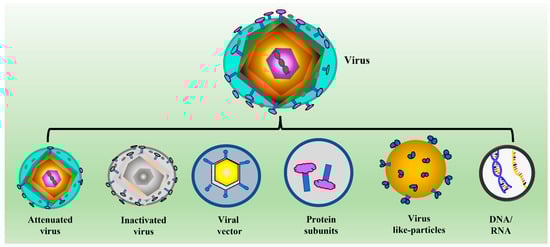 The arrival of subunit vaccines, which involved only a few components of the pathogen, overcame the loophole associated with the traditional vaccine development regime. Apart from the surface proteins (from bacteria, protozoa, and viruses), subunit vaccines may also include pathogen-specific toxin(s) and polysaccharides [5]. The most recent and dramatic development in vaccine formulation is nucleic acid-based vaccines (which include DNA and mRNA) [6]. These vaccines overcome the issues associated with conventional and subunit vaccine development processes, such as the expression and purification of target proteins and the need to propagate serious pathogens [7,8,9]. Thus, nucleic acid-based vaccines gave a new horizon to the therapeutic regimen in healthcare settings; for instance, mRNA-based vaccines against COVID-19 (manufactured by Moderna and Pfizer) are an advancement over the traditional vaccine development against infectious diseases [10,11,12,13]. Thus, there is continuous improvement in the methods and strategies used in vaccine development and delivery. Due to the arrival of newer methods of vaccine design and development, there is a need to redefine vaccines. Today, vaccines can be redefined as biological preparations containing attenuated or killed pathogens or any component, including peptides, proteins, DNA, mRNA, or polysaccharides, which, upon injection, help prevent an individual from any possible future infection [6]. Although subunit and nucleic acid-based vaccines offer several advantages over conventional methods of vaccine development, they still suffer from issues like the need for a cold chain or deep refrigeration and a short shelf life like other common vaccines [14]. Figure 1 shows the different methods of antiviral vaccine formulation.