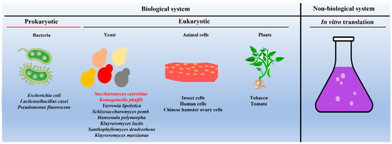 Schematic showing different systems used as hosts for expressing and purifying VLPs. Note: Saccharomyces cerevisiae and Komagataella phaffii (in red font) remain the most commonly used yeast species. In the case of in vitro production of VLPs, one can use the protein translational machinery of either bacteria (prokaryotes) or yeast (eukaryotes).