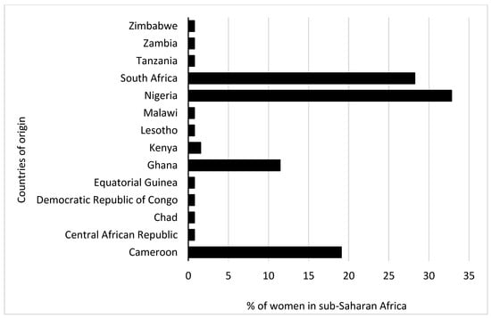 Initially, 2572 participants (male: 1390 (54.0%); female: 1182 (46.0%)) took part in the study, including pregnant and non pregnant women. For this study, a sample size calculation was conducted. We determined that at least 50 pregnant and 50 non pregnant women were required to detect any statistical differences. In consideration of that, the study had a power of 80% to detect statistical differences, assuming a 10% attrition rate. Subsequently, 54 pregnant women were matched for comparison by age with 77 non pregnant women. Their responses were analysed as illustrated in Figure 1. The distribution of the women by their countries of origin is shown in Figure 2, which indicates that the majority were from Nigeria (32.8%), followed by South Africa (28.2%).