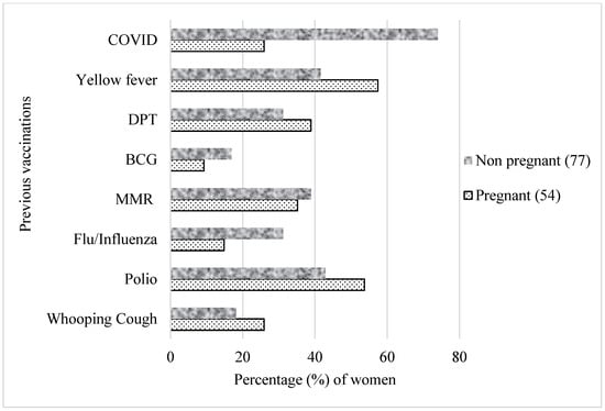 The percentage of pregnant women and their past vaccinations is depicted in Figure 2. Overall, a higher proportion of pregnant women reported having been vaccinated in the past for other conditions compared to non pregnant women, especially against yellow fever (57% vs. 42%) and polio (54% vs. 43%).