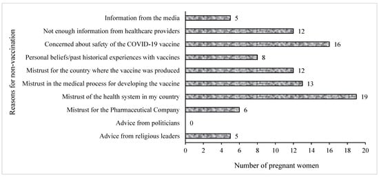 Figure 4 presents the breakdown of the reasons for not getting the COVID-19 vaccine among unvaccinated pregnant women. The most frequently cited reason by pregnant women for not taking the COVID-19 vaccines was mistrust of the health system in their countries (n = 19), while others (n = 16) cited the safety of the vaccines as their main reason for not receiving them. Information from the media and advice from religious leaders contributed the least to the reasons why pregnant women were hesitant towards the COVID-19 vaccines (n = 5), whereas the views of politicians about the vaccines did not influence the women’s decision regarding COVID-19 vaccination.