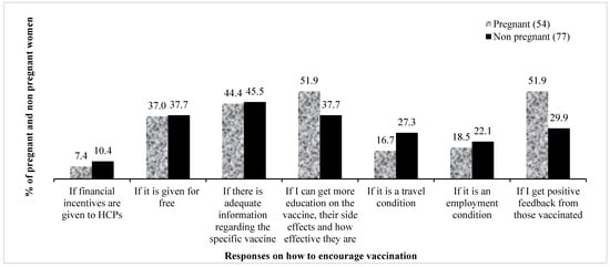 Other participants said that they would accept the vaccine if they were given some form of incentive. Pregnant women were more concerned with feedback about their health and the health of their unborn babies. The following responses typify this: “if I get more education on the vaccines, their side effects and how effective they are” (51.9% cases, 37.7% controls); “if I get positive feedback from those vaccinated” (51.9% cases, 29.9% controls). On the other hand, non pregnant women were more concerned about travel conditions (16.7% cases, 27.3% controls), employment and financial inducements. The participants’ responses regarding the reasons that could increase vaccine acceptance are presented in Figure 6.
