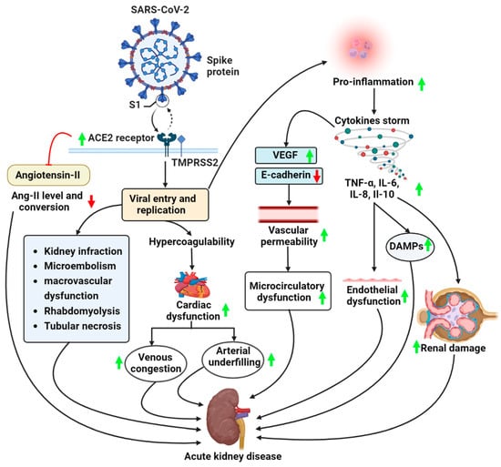 This illustration shows the pathogenesis of COVID-19-associated acute kidney disease (AKD). The receptor binding domain (RBD) of the virus binds to the ACE2 receptor. TMPRSS2 proteases cleave the spike protein of the virus. This supports viral entry from the plasma membrane and replication of the virus, resulting in increased pro-inflammation and cytokine storms, leading to microcirculatory dysfunction, endothelial dysfunction, and renal damage. However, viral entry and replication also lead to increased hypercoagulation, which ultimately leads to increasing cardiac dysfunction. This results in increasing venous congestion and arterial underfilling, which leads to AKD. (Red arrow-Downregulation; Green arrow-Upregulation). (Abbreviations: VEGF, vascular endothelial growth factor; TNF-α, tumor necrosis factor-alpha; IL-6, interleukin-6; IL-8, interleukin-8; IL-10, interleukin-10; DAMPs, damage-associated molecular patterns).
