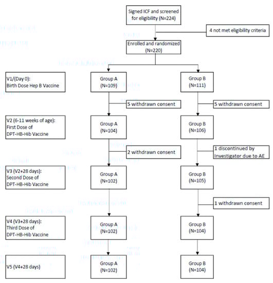 The study population included healthy infants who were 0–3 days old at enrollment, were born between 37 and 42 weeks of gestation, weighed ≥ 2500 g at birth, with fathers, mothers, or legally acceptable representatives who were properly informed about the study and have signed the informed consent form, and with parents who agreed to comply with the indications of the investigator and with the schedule of the trial. Infants were excluded if they developed fever (axillary temperature ≥ 37.5 °C on day 0), had a history of an allergic reaction that was likely to be triggered by any vaccine component, if they had DTP, HB, or Hib infection, had a history of congenital or acquired immunodeficiency, had uncontrolled coagulopathy or blood disorders, had chronic illness, or immunosuppressive conditions, if they were undergoing immunosuppressive therapy, had received immunoglobulin therapy or blood products before starting or during the study, had received a vaccination other than oral polio and the BCG vaccine, were participating in another clinical study, or had a mother who was HbsAg or HIV positive (by rapid test).
