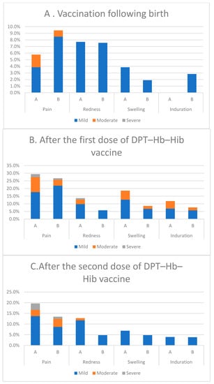 Figure 2 and Figure 3 show the proportion of subjects in each group in whom local (injection site) and systemic reactions occurred after vaccination at birth and after the first, second, and third doses. Most local reactions in all vaccine groups were mild (Figure 2). The most frequently reported local reaction after each dose in each group was pain (>8%). Redness, swelling, and induration occurred with a similar frequency in both groups. Exploratory analyses showed that the incidence of redness and swelling after the first dose was significantly higher than the other doses. The most common solicited systemic reaction was irritability (Figure 3). Fever, which was mild or moderate in intensity and transient, occurred with a similar frequency between the two groups.