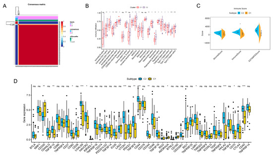 Consensus clustering of prognosis-related lncRNAs and construction of a risk score model in the PDAC cohort. (A) Consensus clustering matrix for k = 2. (B) Boxplots showing difference in immune cell infiltration between cluster 1 and cluster 2. (C) Results of the ESTIMATE algorithm, revealing that the main difference in the TIME between cluster 1 and cluster 2 was in the immune cell components. (D) Boxplots presenting results of difference analysis of multiple immune checkpoint blockade gene expression levels between cluster 1 and cluster 2. In the images, the scattered dots stands for values of gene expression and immune cell infiltration. In the boxes, the bottom borders and the top borders stand for the 25th and 75th percentiles respectively. The transversal line in the box stands for the median value. Statistical difference is expressed by asterisks, * p < 0.05, ** p < 0.01, *** p < 0.001, ns, not significant.
