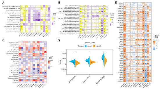 Results of enrichment analysis, TIME feature description and immunotherapy guidance using risk score signature. (A) Heatmap showing the representative pathway terms from Hallmark enriched in each m6A lncRNA and the risk score. (B) Heatmap showing the representative pathway terms from KEGG enriched in each m6A-lncRNA and the risk score. (C) Heatmap showing the significant positive and negative correlations between risk score and multiple infiltrative immune cells in PDAC lesions. (D) Results of the ESTIMATE algorithm demonstrating that patients with different risk scores were significantly different in terms of stromal score, immune score and ESTIMATE score. (E) Heatmap presenting the negative correlation between risk score signature and immune checkpoint gene expression in PDAC. **** p < 0.0001.