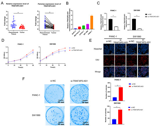 The effect of TRAF3IP2-AS1 knockdown on PDAC cell proliferation and colony formation. (A) The relative expression level of TRAF3IP2-AS1 in five PDAC cell lines was examined via qRT-PCR. (B) The results of qRT-PCR validated the efficacy of TRAF3IP2-AS1 knockdown in PANC-1 and SW1990 cells. (C,D) The influence of TRAF3IP2-AS1 knockdown on the proliferation of PANC-1 cells and SW1990 cells was estimated using CCK-8 assays (C) and EdU assays (E). (F) Knockdown of TRAF3IP2-AS1 improved the colony-formation ability of PDAC cells. * p < 0.05, ** p < 0.01.