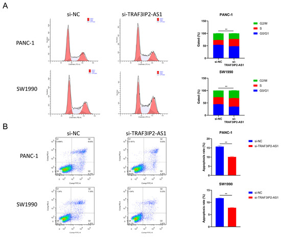 Impact of TRAF3IP2-AS1 knockdown on cell cycle and apoptosis. (A) Knockdown of TRAF3IP2-AS1 caused an increase in the S phase during the cell cycle. (B) The knockdown of TRAF3IP2-AS1 reduced the apoptosis rate of PDAC cells. The results are presented as quadrant-gated plots. Channel PE stands for propidium iodide; channel FITC stands for fluorescein isothiocyanate. The apoptosis rate exhibited in each bar chart is the sum of cell percentages in sections Q2 (late-phase apoptotic cells) and Q3 (early-phase apoptotic cells). ** p < 0.01.