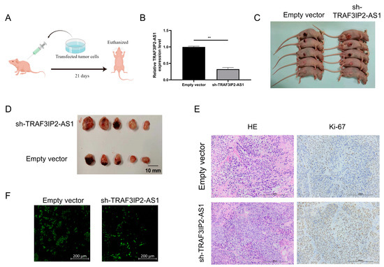 TRAF3IP2-AS1 inhibited PDAC progression in vivo. (A) Procedure of the in vivo experiment. (B) The knockdown efficacy of shRNA was proved by qRT-PCR. (C) Mice were euthanized 21 consecutive days after the subcutaneous injection of transfected tumor cells. (D) Tumors were harvested from the mice after 21 consecutive days. (E) Ki-67 staining showed that the proliferation was more vigorous in tumor specimens from the knockdown group. (F) TUNEL staining showed that the rate of apoptosis was lower within the tumor lesions from the knockdown group. ** p < 0.01.
