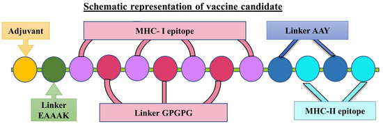 Schematic representation of the multi-epitope-based vaccine designed by linking the MHC-I and MHC-II epitopes of F. nucleatum with the different linkers and adjuvant.