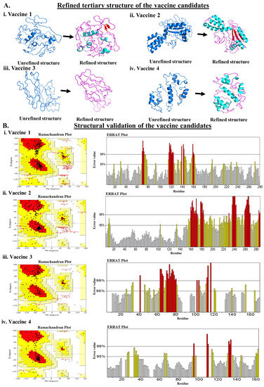 3D structure of the vaccine candidates. (A). Refined tertiary structure of the (i). VACCINE l, (ii). VACCINE 2, (iii). VACCINE 3, and (iv). VACCINE 4. Blue and magenta colors represent unrefined and refined structures. (B). Structural validation of the 3D structures. Ramachandran plot and ERRAT value plots for (i). VACCINE l, (ii). VACCINE 2, (iii). VACCINE 3, and (iv). VACCINE 4.