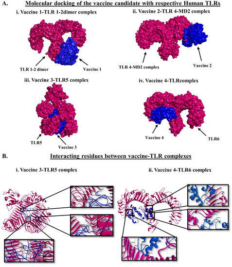 Molecular docking and biomolecular interaction between the vaccine candidates and human TLRs. (A). Molecular docking between (i). VACCINE l with TLR1/2 dimer, (ii). VACCINE 2 and TLR4–MD2 complex, (iii). VACCINE 3 and TLR5, and (iv). VACCINE 4 with TLR6. (B). Interacting residues participating in the molecular docking between (i). VACCINE 3 and TLR5, and (ii). VACCINE 4 with TLR6.
