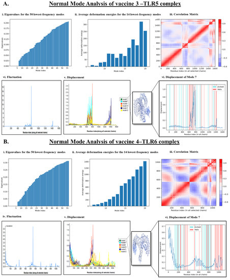 NMA is a useful molecular simulation technique to evaluate the binding stability of two interacting proteins occurring as a complex across different modes throughout the structure of the protein complex [45]. Herein, our study revealed that VACCINE 3-TLR5 and VACCINE 4–TLR6 complexes possess a significant degree of biophysical and perturbational stability throughout the simulation phase (Figure 4). Studies employing WEBnma demonstrated the direction of the domain mobility of the vaccine peptide and human TLR toward each other within the complex, as presented by the arrows in Figure 4. Occurrences of molecular and atomistic motion in the course of protein–protein interactions were evaluated by the correlation matrix that resembles the relationship amongst the pairs of residues in each vaccine–TLR complex (Figure 4A(iii),B(iii)). As given in Figure 4A(iii),B(iii), red, blue, and white colors, respectively, indicate the occurrence of correlated, anti-correlated, and uncorrelated pairs of residual motion with the protein complexes. The high degree of stability of the VACCINE 3–TLR 5 and VACCINE 4–TLR6 complexes was also deciphered by a low eigenvalue of 0.025 and 0.05, respectively (Figure 4A(i),B(i)). The energy associated with each mode was reflected in deformation energies and eigenvalues, which are inversely proportionate to the amplitude of the motion given by the associated modes (Figure 4A(ii),B(ii)). The atomic displacements of the six lowest-frequency modes are shown in Figure 4A(v),B(v). The displacement of mode 7 is shown in Figure 4A(vi),B(vi). The fluctuations of the atomic position are shown in Figure 4A(iv),B(iv). This evidence of deformability and fluctuations within the protein complex during the course of simulation collectively revealed a high degree of structural flexibility and stability of the two protein complexes formed between the designed vaccines and human TLRs.
