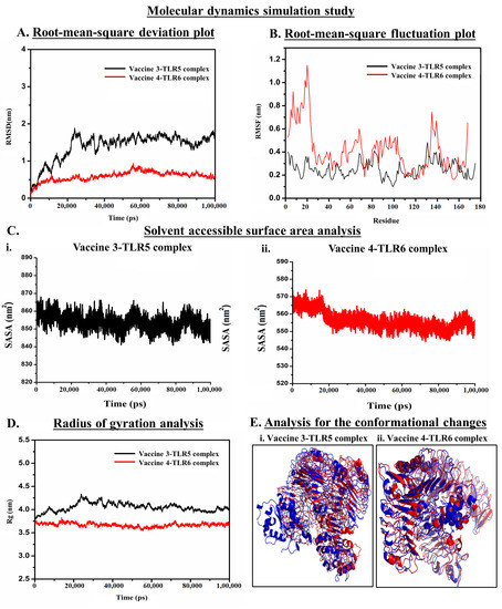 RMSF was employed to demonstrate the flexibility of the two vaccine–TLR complexes for each amino acid residue and the role of each residue in accounting for the mean flexibility of the whole protein occurring as a complex. RMSF is a popular choice to understand the dynamicity of protein–protein interaction [22,29]. The overall flexibility of the designed vaccine candidates determined by the RMSF plot suggests that both the vaccine candidates possess most of the amino acid residues within a very low RMSF range. This result infers that the docking of vaccine candidates with the respective TLRs exhibits a high degree of flexibility which could be correlated with their efficiency in augmenting TLR responses (Figure 5B).