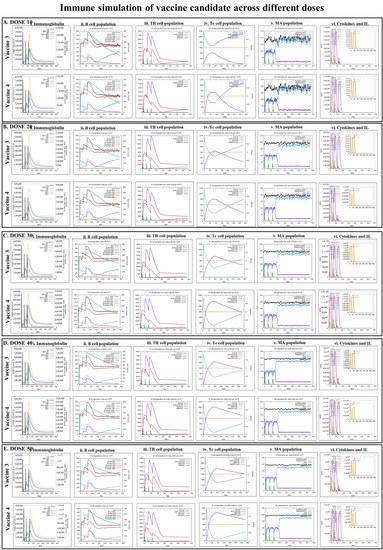 To validate the immunological responses of the designed and in silico screened vaccines, an agent-based immune simulation technique was adopted and executed using the C-ImmSim webserver (http://www.cbs.dtu.dk/services/C-ImmSim-10.1/, accessed on 14 January 2023) [42]. The program uses the amino acid sequence (in FASTA format) of each vaccine to operate the simulation process, and the simulation mimics the administration of the vaccine to stimulate the human thymus, bone marrow, and lymph node. Moreover, it also predicts the ability of the vaccine to induce the differentiation and proliferation of different immune cells, such as cytotoxic T-cells (Tc), helper T-cells (Th), B-cells, immunoglobulins, macrophages, and cytokines, which are generally expressed in response to a vaccine. In the immune simulation experiment, five doses of the designed vaccine, 10, 20, 30, 40, and 50, were administrated through three injections at intervals of 4 weeks. The parameters 1, 91, and 181-time steps were fixed as one step, which is equal to 8 h of real life, and all other parameters were left at their default values [43].