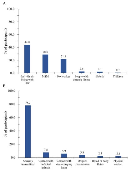 Participates’ perceived groups at high risk (A) and dominant transmission route of Mpox (B). An elderly person is defined as anyone over the age of 60. A child is defined as anyone under the age of 18.