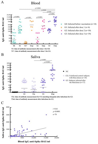 Antibody concentrations in saliva were analyzed in cases (G3) and in uninfected control subjects vaccinated with three doses (CG), before (T3) and following breakthrough infections after third doses (T3ai and T3c, respectively). At T3, IgG specific salivary antibodies were present in 82% of cases (GMC: 40.9 BAU/mL; 95% CI: 15.9–105.1) and in 74% of uninfected controls (GMC: 29.2 BAU/mL; 95% CI: 10.5–81.4). After breakthrough infections (T3ai), salivary antibodies were detected in 100% of cases, showing a 14-fold increase in the GMC (GMC: 570.7 BAU/mL; 95% CI: 369.0–882.7; p < 0.0001). These antibody titers were also higher than those observed at the same time point (T3c) in uninfected control subjects ([GMC: 21.7 BAU/mL; 95% CI: 10.0–80.4; (p < 0.0001)] (Figure 1B), remaining detectable in 72% of them (Figure 1B). A positive correlation between specific salivary and blood antibodies was observed (r = 0.61, p < 0.0001) (Figure 1C).