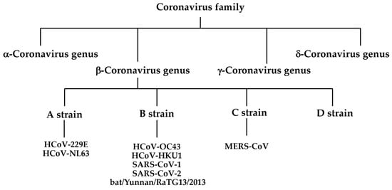 Viruses are officially classified by the International Committee on Taxonomy of Viruses based on their molecular biological properties, including genomic composition and nucleotide sequence similarity []. Coronaviruses are classified within the family Coronaviridae of the order Nidoviridae and suborder Cornidoviridae. The family Coronaviridae is further divided into the subfamilies Retovirinae and Orthocoronavirus, and the latter includes four genera: alpha (α), beta (β), gamma (γ), and delta (δ) (Figure 1) []. MERS-CoV, a bat coronavirus that acquired pathogenicity in humans, was first isolated in 2012 from a patient in the UK with severe pneumonia who had a history of staying for long periods in the Middle East []. MERS-CoV is the causative virus of Middle East Respiratory Syndrome (MERS), with a fatality rate of 35%. MERS is transmitted to humans via dromedary camels, the natural host; however, human-to-human transmission can also occur, and an outbreak occurred in South Korea in 2015.