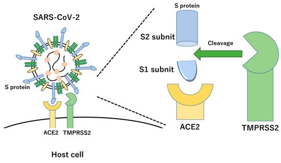 The homology of SARS-CoV-2 genomic RNA and viral proteins with SARS-CoV-1 is 79.0% for genomic RNA, 76.2% for S protein, 94.7% for E protein, 90.1% for M protein, and 90.1% for N protein. Similar to SARS-CoV-1, the S protein of SARS-CoV-2 enters host cells by binding to human ACE2 through complex formation by binding the receptor-binding domain (RBD) of the S protein and ACE2 [,]. However, the S protein of SARS-CoV-2 does not recognize the MERS-CoV receptor DPP4 or the HcoV-299E receptor APN. The RBD of the SARS-CoV-1 S protein is composed of a core structure and a receptor-binding motif (RBM) that directly binds to the ACE2 surface []. Furthermore, six amino acids, Y442, L472, N479, D480, T487, and Y491, of the RBD of SARS-CoV-1 are important for binding to ACE2 and involved in determining the host range of SARS-related coronaviruses. In SARS-CoV-2, the corresponding six amino acids are L455, F486, Q493, S494, N501, and Y505. Analysis of the binding affinity between the RBM of SARS-CoV-2 and ACE2 in various animal species, including humans, revealed that the RBM of SARS-CoV-2 had a high binding affinity with ACE2 in humans, muskrats, pigs, ferrets, cats, orangutans, green monkeys (Chlorocebus sabaeus), and bats (Rhododendronidae) and a low binding affinity with mouse and rat ACE2. One of the major differences between SARS-CoV-2 and SARS-CoV-1 is the characteristic sequence of consecutive basic amino acids (RRAR) at the S1/S2 cleavage site of the SARS-CoV-2 S protein, called the “furin cleavage site”, which is efficiently cleaved by furin and other proteases (Figure 2) [,]. This furin cleavage site is absent in SARS-CoV-1, but is present in the S proteins of MERS-CoV and HcoV-OC43. During the viral replication cycle, the S protein is cleaved into S1 and S2; however, the location and timing of cleavage differ depending on the type of coronavirus. In infected cells, the S protein is synthesized and cleaved by host proteases, or the S protein binds to the receptor and is then cleaved by host proteases when the virus enters the target cell. Since SARS-CoV-1 uses the latter mechanism, the S protein is present on the surface of the viral particle in an uncleaved state. When the virus invades the cell, the S protein is cleaved by host proteases, trypsin, elastase, cathepsin, and TMPRSS2. In contrast, in the case of SARS-CoV-2, cleavage occurs within the cell after S protein synthesis via the first mechanism. The furin cleavage site of the S protein is necessary for SARS-CoV-2 to efficiently infect the human respiratory tract, and the activation of the S protein by TMPRSS2 is also important [].