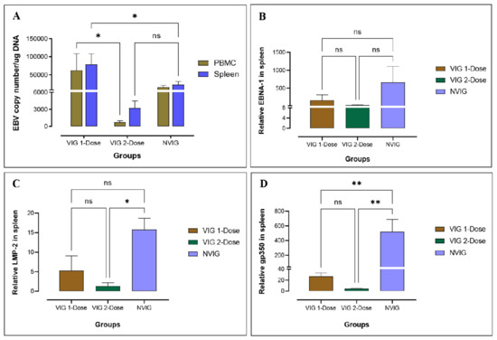 Determination of viral load and EBV gene expression in rabbits. Comparison of viral load by qPCR in the spleen and PBMCs of VIG 1-dose and VIG 2-dose compared to NVIG (A). EBV gene expression in VIG 1-dose and VIG 2-dose compared to NVIG for EBNA1 (B), LMP-2 (C), and gp350 (D) in the rabbit spleen. All the data here are normalized with NVNIG. ns: p > 0.05, * p ≤ 0.05, ** p ≤ 0.01.