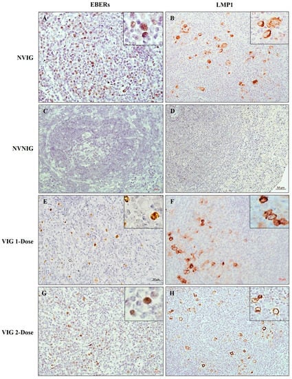 EBER in-situ hybridization (EBER-ISH) and LMP1 immunohistochemistry were performed on the spleen of all animals, VIG, NVIG, and NVNIG, to assess the extent of EBV infection. As expected, NVIG animals were clearly susceptible to EBV infection (Figure 3A,B), whilst NVNIG animals were clearly negative (Figure 3C,D). Disappointingly, vaccinated animals (VIG 1-dose or 2-dose) were not protected from EBV infection (Figure 3E–H). Interestingly, we observed occasional BZLF1positive cells in the spleen of NVIG animals but not in the vaccinated animals (Figure S1). Irrespective of the dose (1-dose or 2-dose), all VIG animals remained healthy and active during the entire course of the experiment. Thus, the VLP vaccine was safe but not effective in preventing EBV infection.