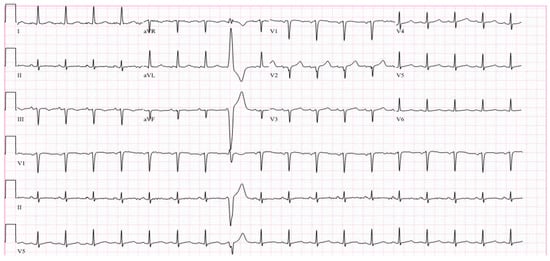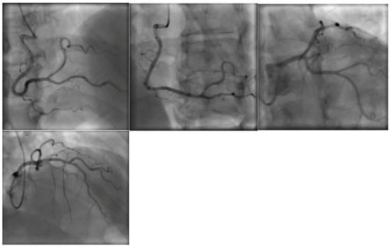 While at the outside hospital on 10 October 2022, she received an echocardiogram as part of her syncope workup, which showed a normal left ventricle with an ejection fraction of 55–60% and normal systolic and diastolic function. A repeat echocardiogram was ordered on 26 October 2022 while the patient was at UUH, which showed an ejection fraction of 31% with wall motion abnormalities (Figure 1, Table 2). ProBNP levels were elevated at 7616 pg/mL. Serial troponin levels showed elevated levels that were down-trending, from 42 ng/L on 23 October 2022 to 20 ng/L on 27 October 2022. An EKG on 25 October 2022 showed sinus tachycardia, with occasional premature ventricular complexes, with poor precordial lead R wave progression in V1–V3 (Figure 2). A cardiac catheterization was performed on 28 October 2022, which showed normal coronary arteries and a low–normal ejection fraction of 50–55% (Figure 3). A differential diagnosis of Takutsobo’s cardiomyopathy versus COVID-19 cardiomyopathy was made. Takutsobo’s cardiomyopathy was included in the differential diagnosis given days before, when the patient had been told that she may have metastatic breast cancer.