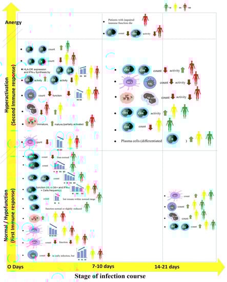 In the hyperactivation immune response stage, mild patients recover as their T cell and B cell counts gradually increase [48,49]. The count of their plasma cells as well as the activity of their CD4+ and CD8+ T cells also increase, but their CD8+ T cell count decreases. In contrast, severe patients exhibit further decreases in the count of T cells and B cells [53,54]. The overactivation of CD4+ and CD8+ T cells appears in deceased patients at this stage more than in those recovering from severe illness [55,56]. Deceased patients display a decrease in the count and activity of monocytes, DCs, and NK cells, while survived patients exhibit an increase in monocyte count and activity [53,57]. Moreover, emergency myelopoiesis (release of immature neutrophils and increase in mature/partially activated neutrophils) occurs in severe patients [49].