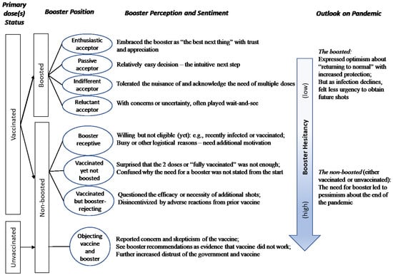 Figure 1 presents a visual depiction of the key findings grouped by participants’ vaccination status and along the continuum of low to high booster hesitancy.