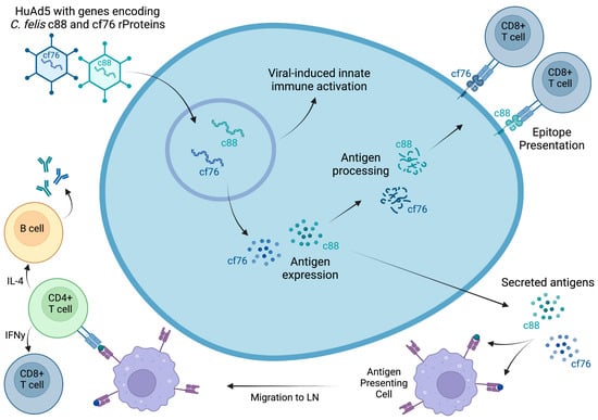 Proposed mechanism of action of the HuAd5 vector vaccine encoding putative C. felis antigens, c88 and cf76. Created with BioRender.com, accessed on 30 January 2023.