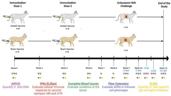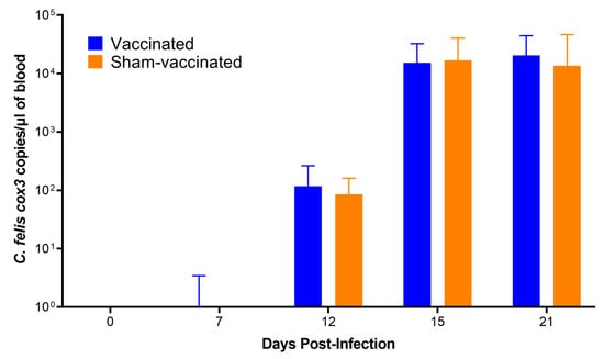 A total of twelve (n = 12) spayed/neutered specific pathogen free (SPF) domestic cats were obtained from the Andrea D. Lauerman Specific Pathogen Free Feline Research Colony at Colorado State University (Fort Collins, CO, USA). Cats intended for the vaccine (n = 6) and sham-vaccine (n = 6) were group housed within an AAALAC International-accredited animal facility at Oklahoma State University (Stillwater, OK, USA) and were fed dry/wet food with access to water ad libitum for the duration of the study. All the cats were examined clinically for their health status and were allowed to acclimate for 21 days prior to initiation of the study. Temperature sensing microchips (Bio Medic Data Systems, Seaford, DE, USA) were subcutaneously implanted in the dorsum, and body weights, temperatures (acquired via thermal microchips), and blood samples were obtained prior to vaccination on day 0 to serve as a baseline measurement. All cats were considered in good health and confirmed to be C. felis-negative by ddPCR at onset of the study [].