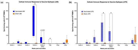Cellular immune response to vaccine epitopes following the vaccination in vaccinated and sham-vaccinated groups: (a) c88; (b) cf76. Vaccination induced a strong cellular immune response in the vaccinated cats which was peaked after the booster dose. However, the cellular response decreased over time and was not sustained during the course of infection. * p < 0.05.