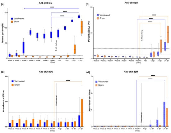 C. felis-specific anti-c88 and anti-cf76 antibody levels in cats: (a) anti-c88 IgG; (b) anti-c88 IgM; (c) anti-cf76 IgG (d) anti-cf76 IgM. A pronounced anti-c88 IgG response was observed in vaccinated cats at week 4 post-vaccination which was sustained throughout the study, including the infection challenge. A notable anti-cf76 IgG response was not observed in response to vaccination cf76. Dashed horizontal line in (a) indicates the strong positive cutoff, as reported in []. Upper dashed horizontal line in (b) indicates strong positive cutoff, while the lower dashed horizontal line indicates weak positive cutoff, as reported in []. Dashed horizontal lines in (c,d) indicate positive cut-off values established as previously described []. **** p < 0.0001.