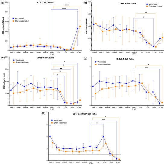 Changes in the number of CD4+, CD8+, and CD21+ cells were analyzed by flow cytometry and plotted against time (Figure 5). There was no difference in the number of CD8+ cells between the vaccinated and sham-vaccinated group following the vaccine regimen (Figure 5a). However, in both groups, CD8+ cell counts were significantly elevated at 21 dpi, indicating a pronounced CTL response to C. felis challenge. Additionally, there was no significant difference in CD4+ cells between the two groups (Figure 5b) over the course of the study, but at 15 dpi, CD4+ were significantly decreased in both groups in response to C. felis challenge. During the immunization phase, CD21+ cells were slightly elevated in vaccinated cats at week 2 and week 6, suggesting a B-cell response to immunization following each dose (Figure 5c). However, this was not significant, and there was no significant difference in the number of CD21+ cells observed between the vaccinated and sham-vaccinated group over the course of the study. Interestingly, CD21+ cells decreased significantly following C. felis challenge and was most pronounced at 12, 15, and 21 dpi. No significant difference in the B-cell:T-cell ratio (Figure 5d) or CD4+:CD8+ ratio (Figure 5e) was observed between the two groups at any point during the study. However, there was a transient increase in the CD4+:CD8+ ratio in response to C. felis challenge at 12 dpi, followed by a significant decrease in both the B-cell:T-cell ratio and the CD4+:CD8+ ratio at 21 dpi.