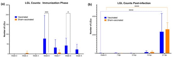 Total number of large granular lymphocytes (LGLs) per μL of blood: (a) pre-infection; (b) post infection. Vaccinated cats had significantly higher LGLs during the immunization phase. C. felis infection significantly increased LGLs in both vaccinated and sham-vaccinated groups. **** p < 0.0001; *** p < 0.001; * p < 0.05.