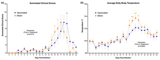 Following tick infestation, cats were examined and evaluated daily (every 24 h) for different clinical parameters, as outlined in Table 1. Overall clinical scores for both the vaccinated and sham-vaccinated groups increased slightly at 3 dpi but remained low until 14 dpi (Figure 7a). Clinical scores of the sham-vaccinated cats increased earlier in the course of C. felis challenge, and were significantly elevated over vaccinated cats at 15 and 16 dpi (p = 0.0206 and 0.0424, respectively). A considerable delay in the onset of clinical signs was appreciable in vaccinated cats until they peaked at 18 dpi, and at 19 dpi, they were transiently elevated over sham-vaccinated cats that were recovering from acute infection (p = 0.0102). Vaccinated cats also exhibited lower average body temperatures during C. felis challenge when compared to sham-vaccinated cats (Figure 7b). Average body temperatures of vaccinated cats remained within ±1 °F of the normal reference range (98.1–102.1 °F) for the duration of C. felis challenge. In sham-vaccinated cats, average body temperatures increased significantly over at 13 dpi and remained elevated through 16 dpi. Four of the six sham-vaccinated cats developed temperatures over 104 °F (40 °C) at multiple timepoints, whereas the highest temperature reached in the vaccinated group was 103.1 °F (39.5 °C) in one cat.