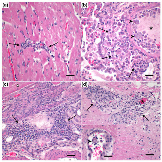 Histopathology of C. felis infection in sham-vaccinated cats. (a) Sham-vaccinated cats exhibited slightly increased mononuclear inflammation (arrows) in the interstitium of the heart. (b) The lungs of sham-vaccinated cats exhibited pronounced mononuclear inflammation (arrows) and occlusion of vessels (asterisk) with intravascular schizonts (arrowheads) containing 1–3 µm merozoites. (c) Renal tubules (☆) were effaced by mononuclear inflammatory infiltrates (arrows). (d) Cerebral vessels (asterisk) were disrupted by mononuclear infiltrates (arrows). Cerebral vessels occasionally contain intravascular schizonts (arrowhead). Magnification: (a,b, inset d) 60×, scale bar = 12 μm; (c,d) 40×, scale bar = 25 μm.