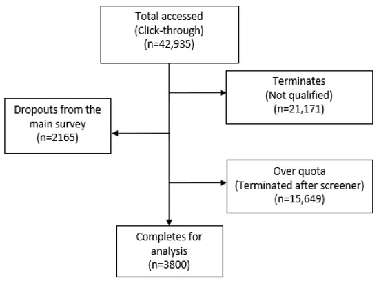 Select questions were filtered to appear based on the respondent’s previous answer. The recruitment rate of respondents who accessed the screener questionnaire (n = 42,935), and whose answers were subsequently used for analysis, was 9% (n = 3800) (Figure 1). As quotas were set on age, income, and region, if such quotas were already met, even respondents who qualified to complete the questionnaire were not permitted to do so (i.e., “over quota”). Of the 3800 responses, 19 were collected via offline recruitment and used the CAWI methodology for data collection. All 3800 respondents answered the entire questionnaire, and no questions were left blank.
