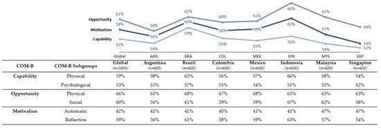 COM levels were generally moderate across all countries (in the range of 52–66%), with Capability and Motivation scores consistently lower than Opportunity scores (Figure 3). Argentina and Singapore had the lowest scores on all COM-B factors, while Indonesia had the highest Opportunity and Motivation scores.
