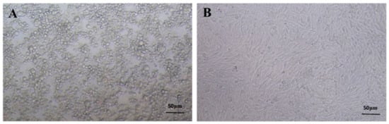 The proliferation of PRV in BHK-21 cells. (A) PRV-infected BHK-21 cells. (B) Normal BHK-21 cells.
