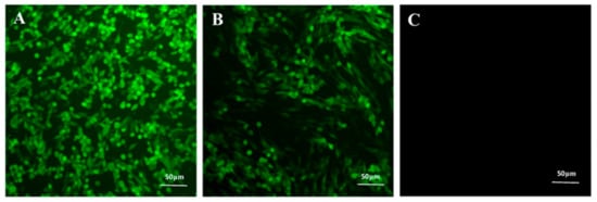 Following 24 h after virus inoculations, over 90% of the BHK-21 cells exhibited green fluorescence. However, the BHK-21 cells inoculated with both PRV and disinfectants showed significantly lower or negligible green fluorescence, indicating complete inactivation of the virus (Figure 2). The results demonstrate that disinfectants inactivated the virus.