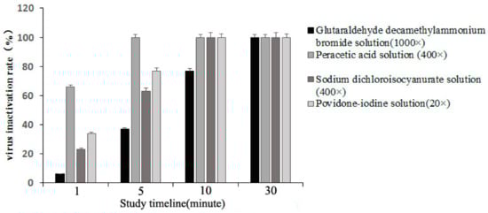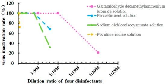 Next, virus inactivation rates for the four disinfectants at different dilutions and their respective active components were investigated for 100% virus inactivation rate at room temperature for 30 min. The best dilution and effective content of glutaraldehyde decamethylammonium bromide solution were 1:1000 dilution and 0.1 g/L; the best dilution and effective contents of peracetic acid solution and sodium dichloroisocyanurate were 1:400 dilutions and 0.5 g/L, and the best dilution and effective content of the povidone-iodine solution was 1:20 dilution and 2.5 g/L, respectively. Figure 3 illustrates the virus inactivation rates for the four disinfectants at different dilution rates.