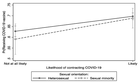 Figure 2 presents whether sexual orientation moderates the association between the perceived likelihood of receiving the COVID-19 vaccine and the likelihood of contracting COVID-19. There was a significant interaction between sexual orientation and the likelihood of contracting COVID-19 (chi2[2] = 28.33, p < 0.001). Heterosexual and sexual minority individuals who had a greater perceived likelihood of contracting COVID-19 had the highest probability of being likely to receive the COVID-19 vaccine compared to their counterparts who reported their likelihood of contracting COVID-19 as not likely.