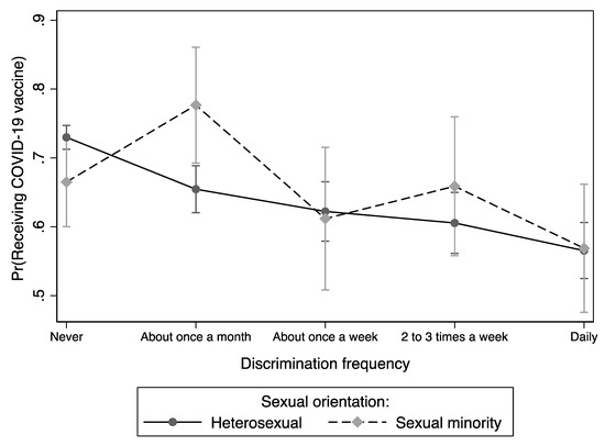 Sexual minorities face a multitude of socioeconomic and structural factors that adversely impact their health outcomes, including discrimination and stigma [57,58,59,60]. Indeed, sexual minority persons have reported high levels of discrimination during the pandemic [4,61,62]. In the present study, individuals that reported discrimination once a week or more had the lowest probability of receiving the vaccine for both sexual orientation groups. Avoidance of medical care because of perceived discrimination has been documented among racial/ethnic and sexual minority groups [63,64,65]. Thus, discrimination experiences may also lead to vaccine hesitancy [48], highlighting a need to improve trust and engagement in healthcare settings with populations vulnerable to discrimination. Interestingly, sexual minority individuals who experienced discrimination once a month had the highest perceived probability of receiving the COVID-19 vaccine, indicating a deviation from prior literature [66,67]. Thus, further research is needed to elucidate the mechanism behind this finding.
